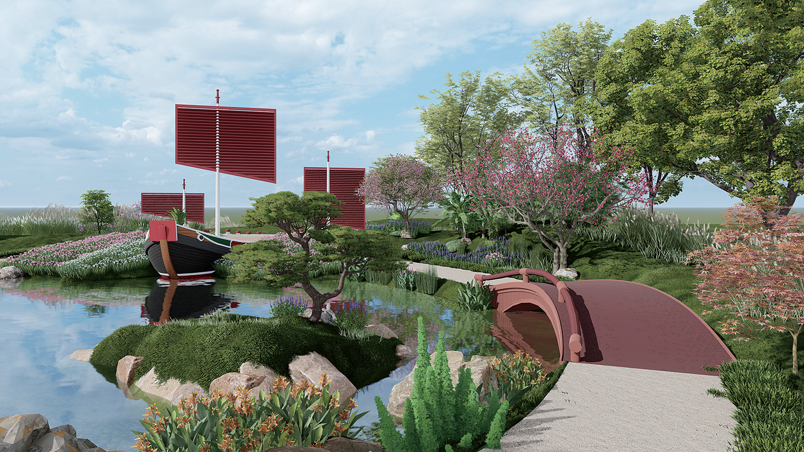 舟山园设计,入园即是千帆竞渡之景,一艘舟山传统帆船“绿眉毛”船头上扬,指向“大海”彼岸的“山”,遥相呼应,点出“舟”“山”特色。