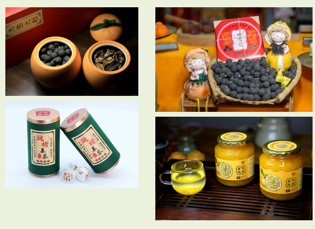 柑儿文、瓯柑陈皮、瓯柑姜茶、瓯柑饼、蜜炼瓯柑、瓯柑爽口条等瓯柑衍生产品。