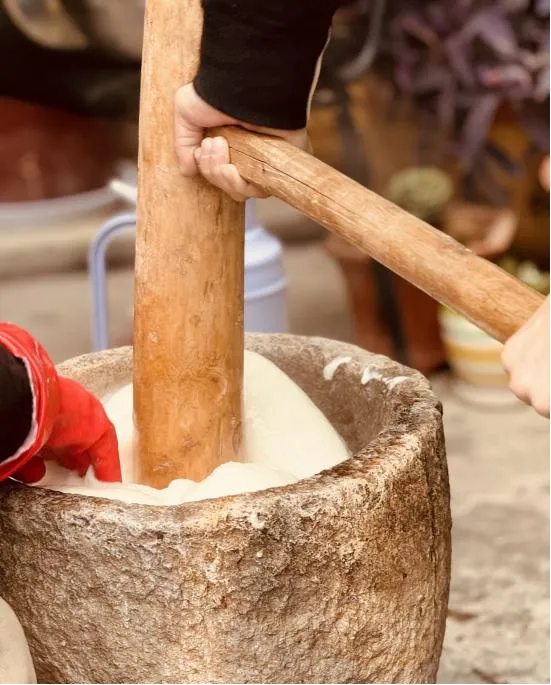 捣年糕是中国传统手工制作年糕的工艺,通过捶打蒸熟的米团使其变得柔韧有弹性,寓意“?年年高升”。