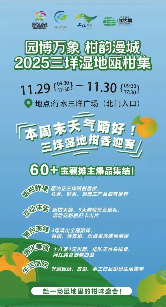 温州生态园作为2026年温州国际园林博览会的活力生态湿地分会场,三垟湿地正以最美的生态姿态,迎接世界目光。今年瓯柑集,正是我们献上的第一场园博会分会场预演活动,也是一场“湿地共生·园博共融”主题新闻发布活动,邀您共赴一场生态、文化与丰收交织的盛会。