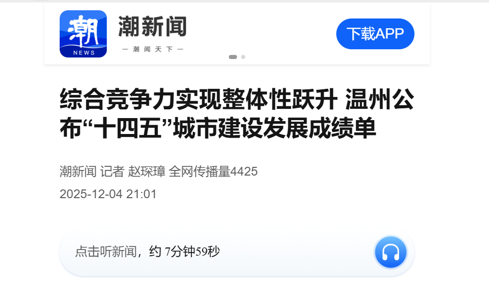 “十四五”期间,温州坚定扛起提速打造“全省第三极”的使命担当,以“强城行动”引领城市规划、建设、管理高质量发展,城市综合竞争力实现整体性跃升。去年全市GDP达到9719亿元、总量跃居全国第28位,常住人口达到985万人,今年将冲刺“双万”城市目标。