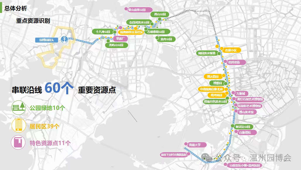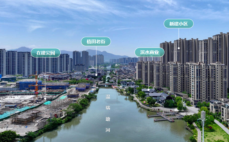 据悉,塘河沿线是瓯海区的“功能复合核心区”。周边串联温州南站(交通枢纽)、三垟湿地(城市绿心)、瓯海区政府(行政中心)、温州肯恩大学(教育高地),更密集分布60个重要资源点——10个公园绿地、39个居民区、11个特色资源(如青灯石刻博物馆、梧田老街)。