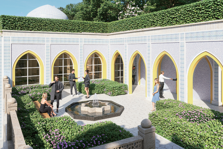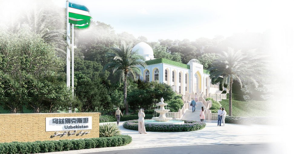步入乌兹别克斯坦园,游客将亲身体验一场以园林为载体的丝路文明对话。园内每一处设计,都融入了对陆海丝绸之路互联互通的思考。
