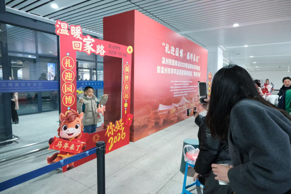 2月2日,春运首日。铁路温州南站人流如织,步履匆匆中,一股浓郁的年味悄然弥漫开来。在西站房出站口,一排火红的志愿服务摊位格外引人注目——“礼迎园博·福伴春运”暖冬行动正在这里温暖启程。