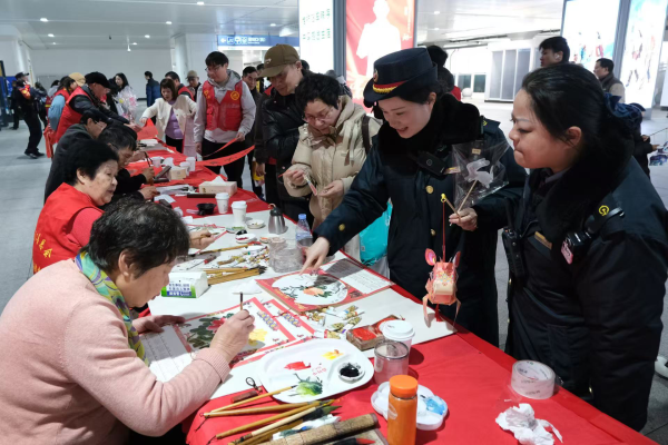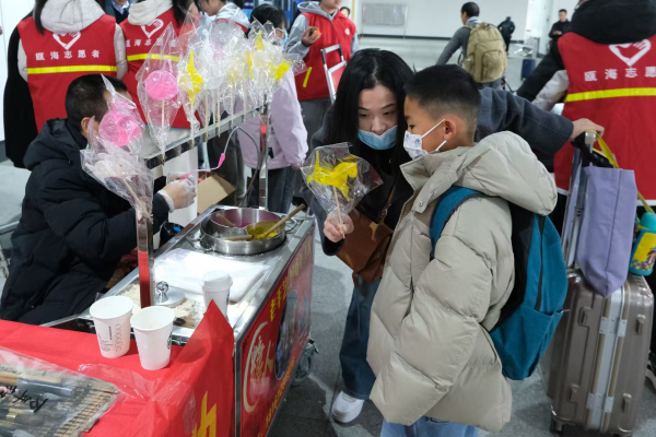 墨香混着糖香,笑语伴着问候。写春联的桌案前围拢着期待的眼神,红纸铺展,笔走龙蛇,一个个风格各异的“福”字在志愿者手中诞生;吹糖人的师傅巧手翻飞,顷刻间,栩栩如生的小动物造型便递到孩子们手中;一旁的免费咖啡摊飘散着醇香,给旅途增添了几分喜悦……“领了春联和‘福’字,这过年的感觉,一下子就浓了!”旅客厉先生向记者扬了扬手中墨迹未干的春联,笑意写满脸庞。