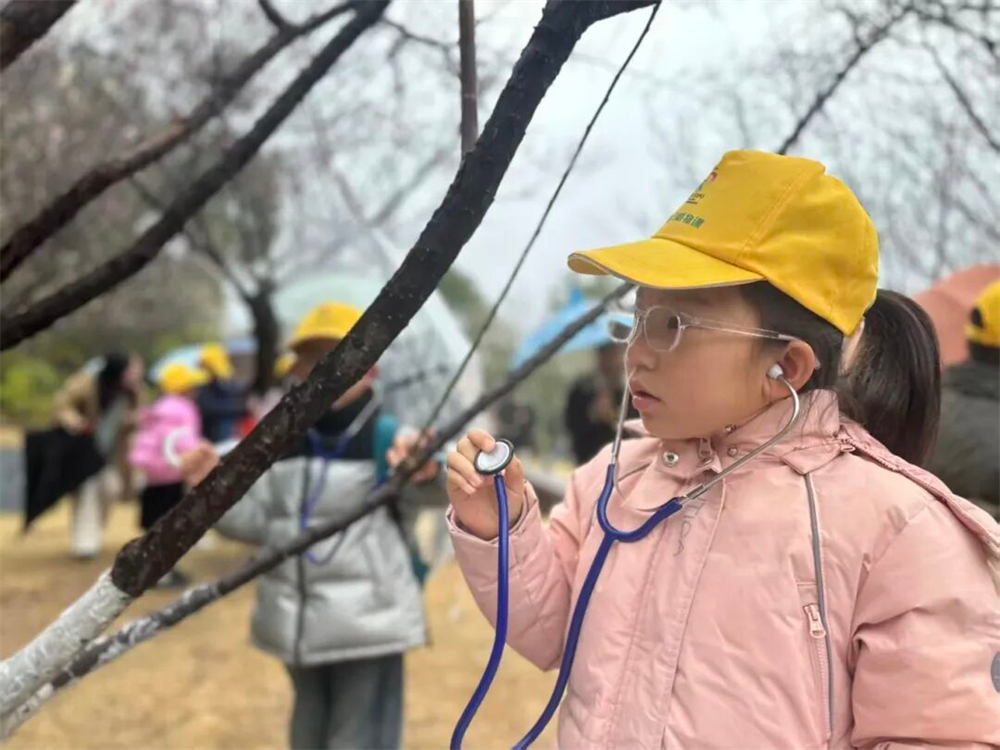 他们迫不及待地拿起听诊器,紧紧贴在梅树的枝干上,闭上眼睛,用心聆听植物内部的输水生长声响。听完声音后,小学员们又仔细观察梅花的植株形态,系统学习梅花耐寒生长的生物特性与自然知识。他们就像一群小科学家,在探索中不断发现着大自然的奥秘。