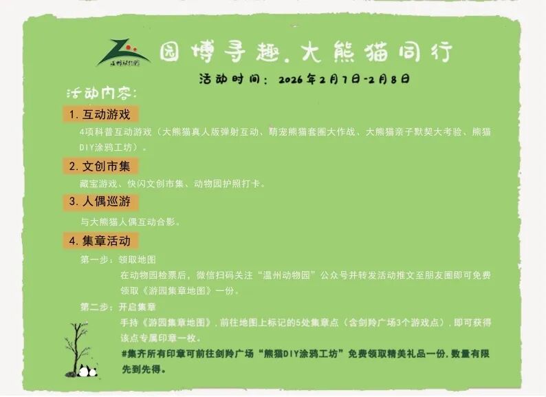 作为第十五届中国(温州)国际园林博览会的博览点,在“宝弟”(雁雁)“宝妹”(楠楠)定居温州满8个月的纪念时刻,景山森林公园(温州动物园)推出“迎园博·游景山”系列活动——“园博寻趣?大熊猫同行”主题文化节,本周末即将温暖来袭!带你走进“国宝”、玩转科普、解锁好礼,共同奏响园博会的萌趣前奏!