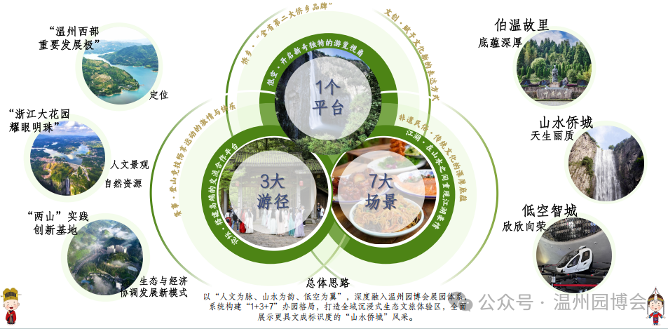 作为此次园博会的文旅融合分会场,文成积极响应“全城园博”的号召,聚焦展现底蕴深厚的“伯温福地”、天生丽质的“山水侨城”、欣欣向荣的“低空智城”的主线,锚定温州西部重要发展极的定位,充分发挥浙江大花园耀眼明珠、全国“两山”理论实践创新基地等优势,围绕提升打造优质旅游IP继续大做文章,推出了以“入福地森呼吸梦江湖”为主题的分会场,并构建起了“1个平台+3条游径+7个场景”的办园体系。