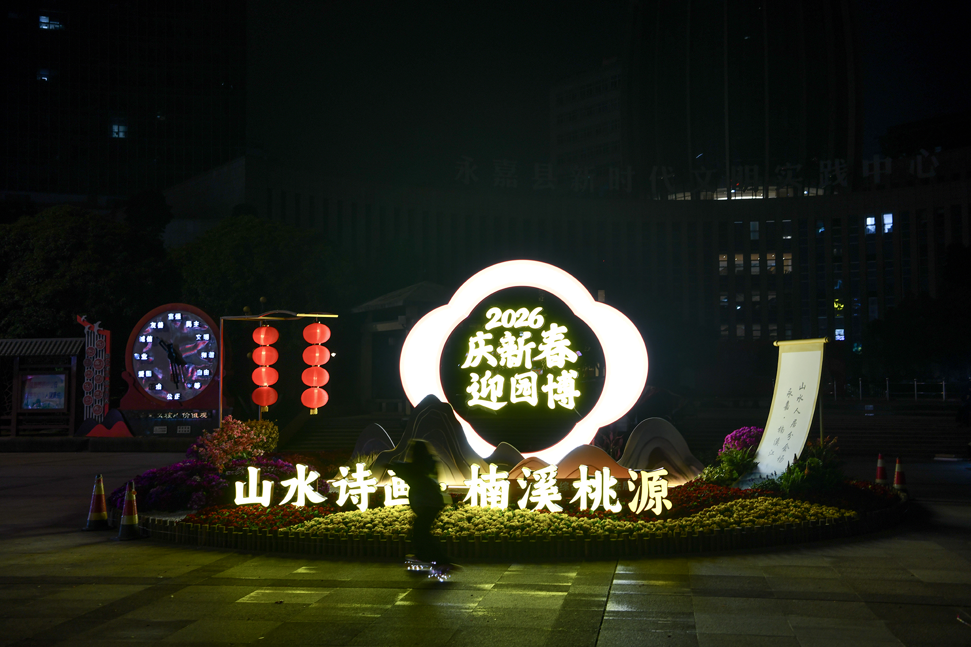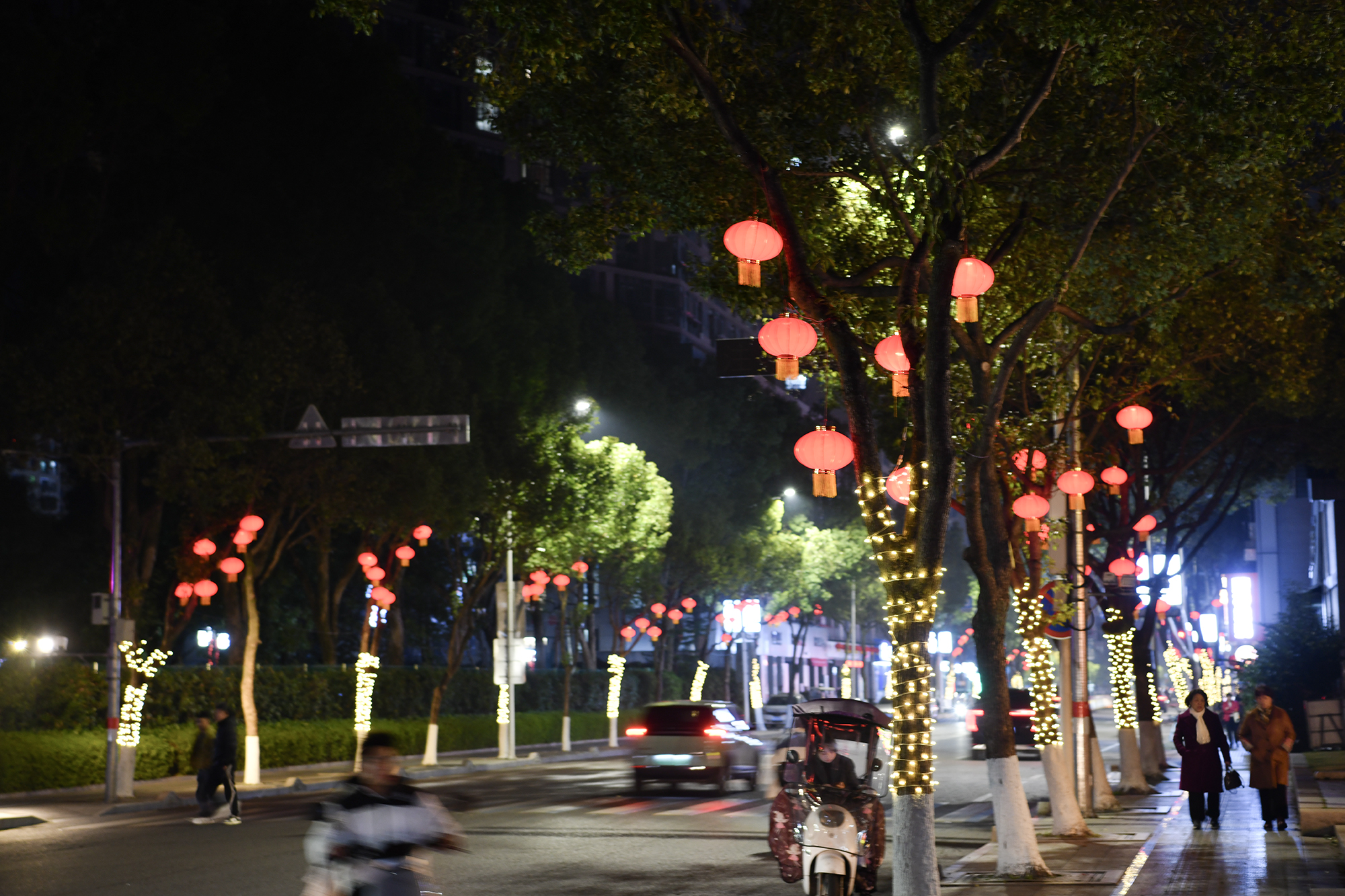 除了花境,夜幕降临的永嘉县城也同样满是新春的氛围,红红的灯笼和灯带高高挂起,装扮着行道树。马年新春即将到来之际,该县通过花境摆设、行道树装扮等布置形式,向广大市民传递新春祝福,为市民营造出一个欢乐、喜庆、祥和的节日氛围。