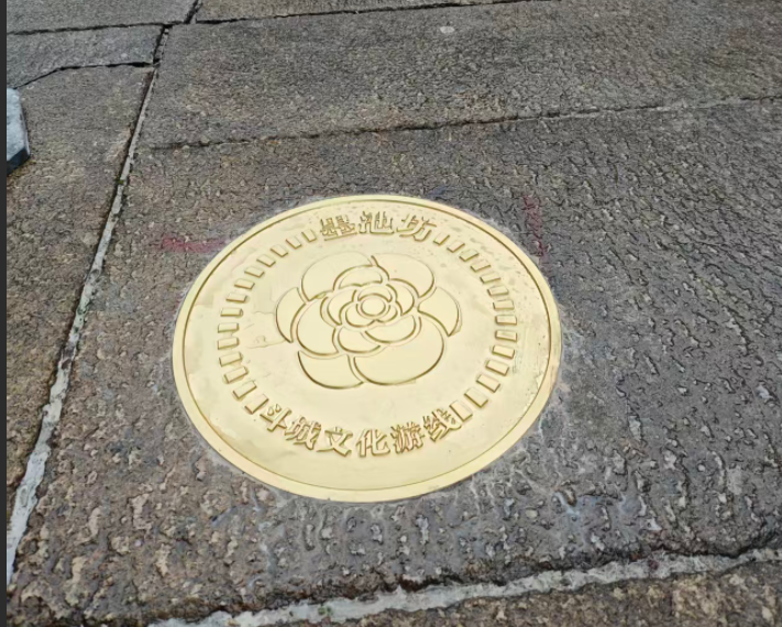 铜牌选用黄铜材质,耐磨损、有质感,采用“线形、嵌入、点状”铺装工艺,现已全部铺装完成,让标识不仅是功能,更成为一种城市微景观。
