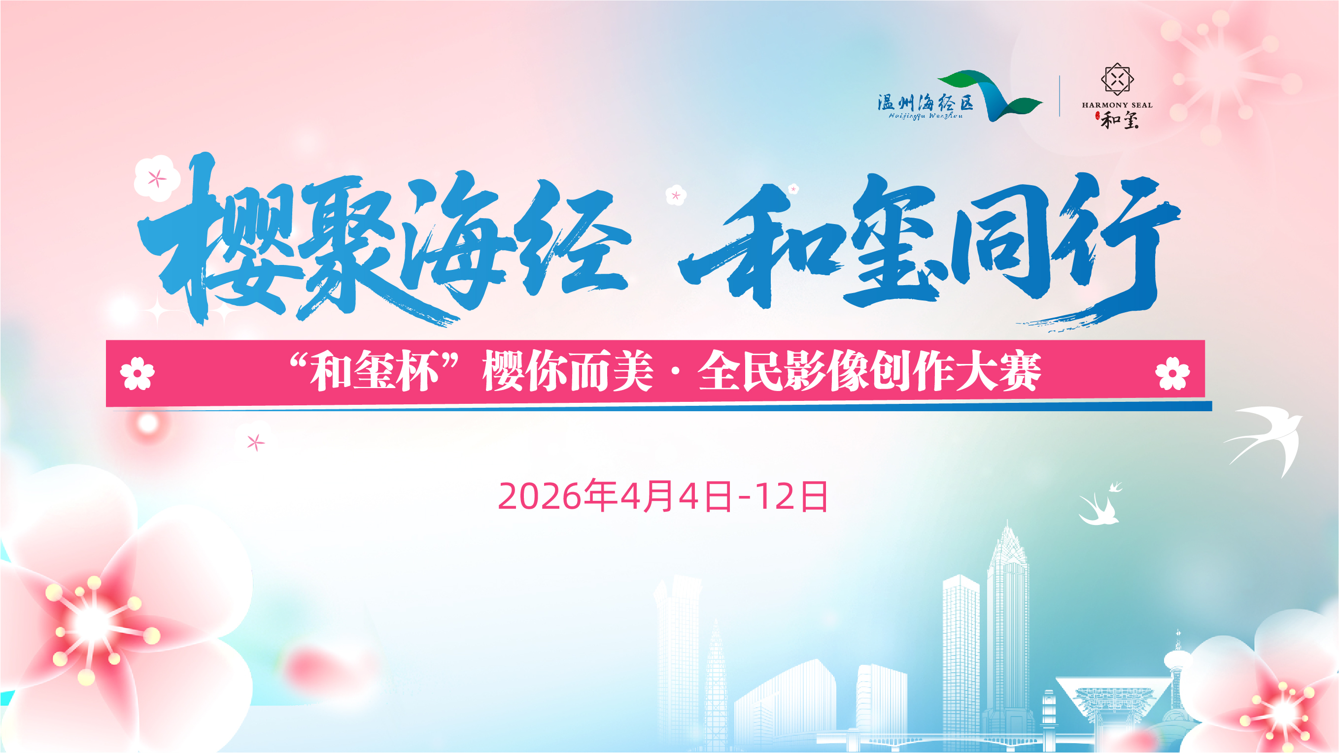 樱绽海经,光影留芳。2026温州海经区第九届樱花文化周将于4月4日至12日浪漫启幕。为点燃春日赏樱氛围,全方位展现海经区“公园里的城市”生态之美与产城融合魅力,由温州瓯江口文旅发展有限公司主办、乾庚和玺协办的“和玺杯”樱你而美·全民影像创作大赛正式启动,面向全国影像创作爱好者发出邀约,以镜头定格樱花盛景,以创意畅想海经未来。