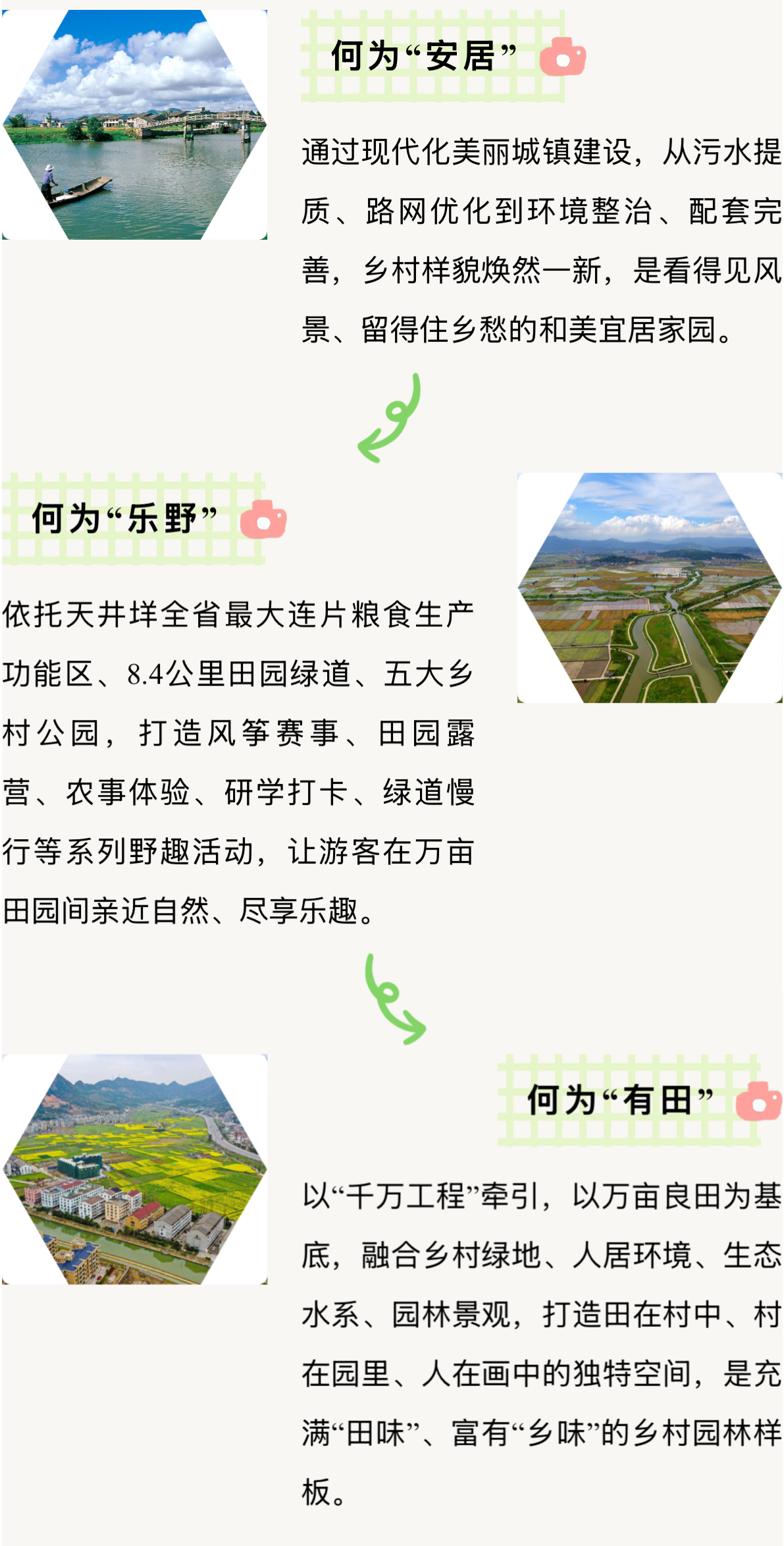 内环为天井垟绿道慢行环,串联核心景观;外环为乡村绿色生活范式圈,联动11个村落,展现宜居风貌。