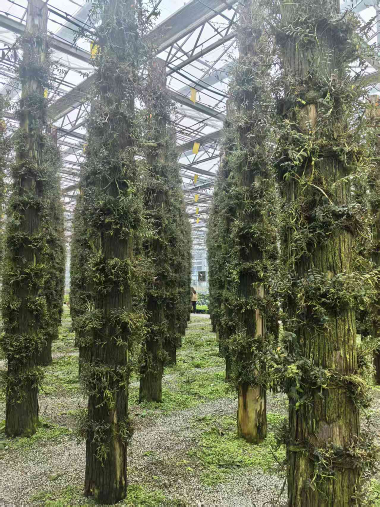 在2号5G智慧温室,由240根杉木组成的仿生树阵格外吸睛。树干上种植的是温州本土的道地药材——铁皮石斛。近年来,原野集团引入高级科研人才,加大对多种“林下经济”药食同源植物的研究,研究团队与欧美专家联合共建AI生物智能育种平台。以石斛为例,通过对石斛的基因组测序,结合AI大模型数据分析,在幼苗期就预测出它未来开花的时间、花朵的形态、甚至石斛多糖的含量,把选育周期缩短了将近三分之二。