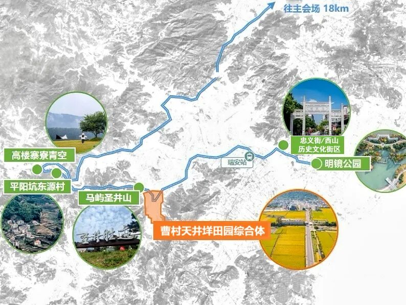 内环为天井垟绿道慢行环,串联核心景观;外环为乡村绿色生活范式圈,联动11个村落,展现宜居风貌。