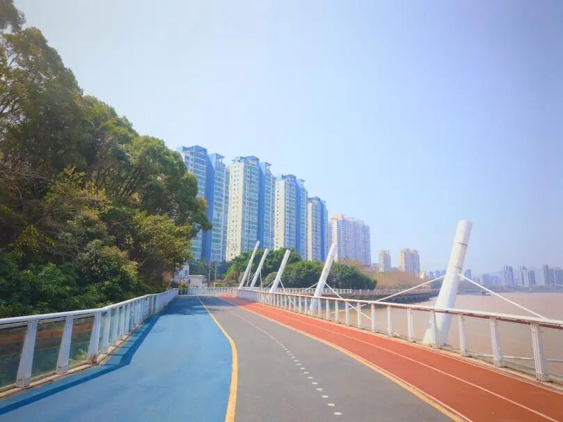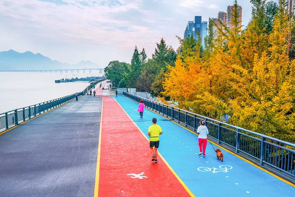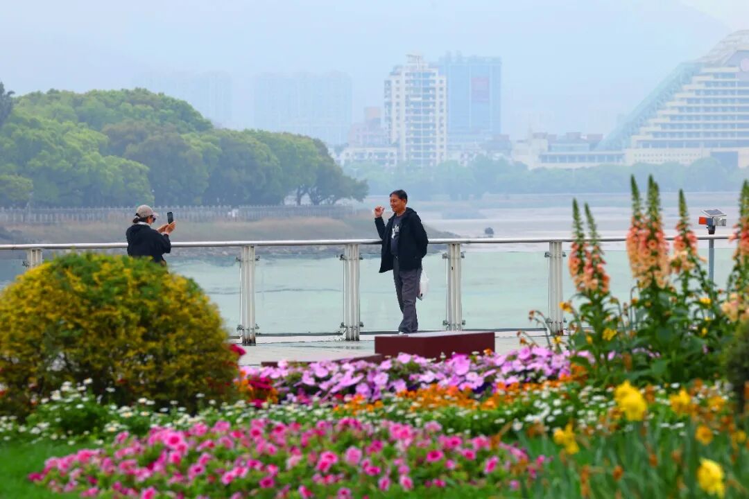 眼下,粉紫色的花境正值盛放,细叶美女樱和超级凤仙连成一片。晨跑者沿着蓝色绿道一路向东,透过无患子与桂花的间隙,江景若隐若现。江滨带状公园,依然是那条陪伴温州人的滨江绿带,只是变得更好了——更健康、更舒适、更有趣。