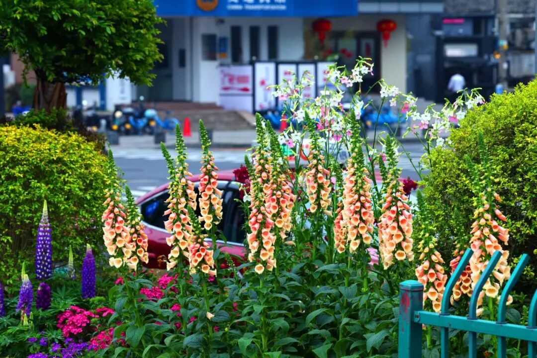 在骨架之下,打造层次丰富的复层植物群落:以金叶大花六道木、亮晶女贞球等灌木营造精致组团,林下搭配八仙花、圆锥绣球等形成缀花基底。主要景观方面以细叶美女樱、羽扇豆、毛地黄、超级凤仙等粉紫色系花卉打造多彩花境,呈现连续饱满的观赏效果。