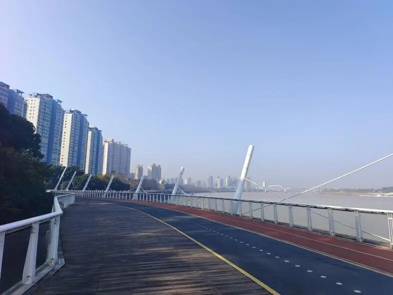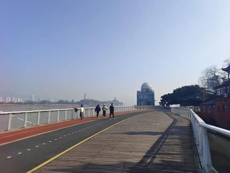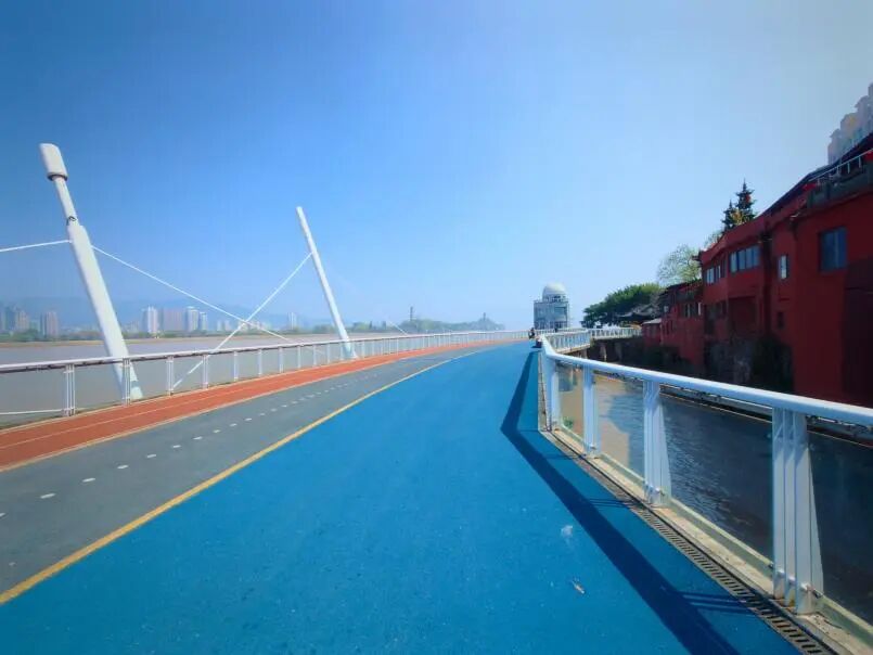 沿江绿道是市民日常散步、跑步的主要通道。原有的木地板铺装,经过多年风吹日晒,部分区域出现腐烂、翘起等问题,既影响美观,也存在安全隐患。本次将木质铺装更换为流线型蓝色渐变彩色沥青,与瓯江水面遥相呼应,形成“蓝道”视觉意象。新铺装平整舒适、防滑耐磨,无论是散步、慢跑还是轮椅通行,都更加顺畅安心。