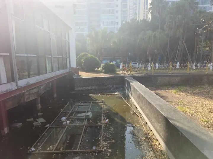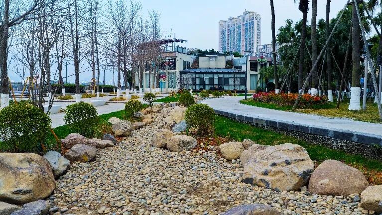 星龙海鲜广场周边,有一处废弃多年的景观水池。由于长期闲置,水质恶化、设施破损,成为滨江绿带中的一处“伤疤”。本次通过填土重塑地形,将其改造为一处具备雨水滞蓄功能的旱溪景观。旱溪雨季蓄水、旱季成景,融入海绵城市理念,搭配耐湿植物与自然置石,形成一处可供市民驻足、休憩、亲近自然的生态节点。
