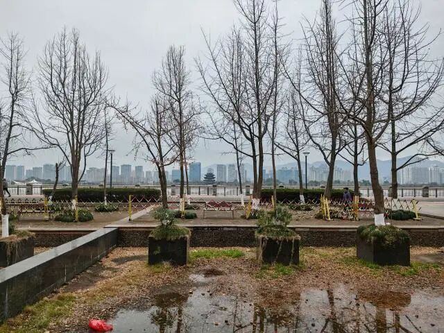 本次绿化提升以现状植被梳理与优化配置为核心。保留长势良好的无患子、桂花作为上层骨架,移除景观效果不佳的蒲葵,局部点植美人梅,打通视线通廊,实现瓯江景观的有效透景。
