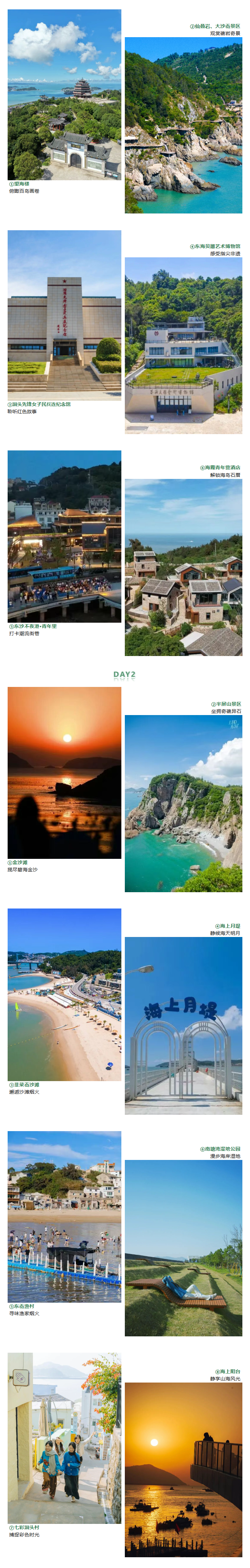 Day 2 :金沙滩→半屏山景区→韭菜岙沙滩→海上月堤→东岙渔村→南塘湾湿地公园→七彩洞头村→海上阳台→返程