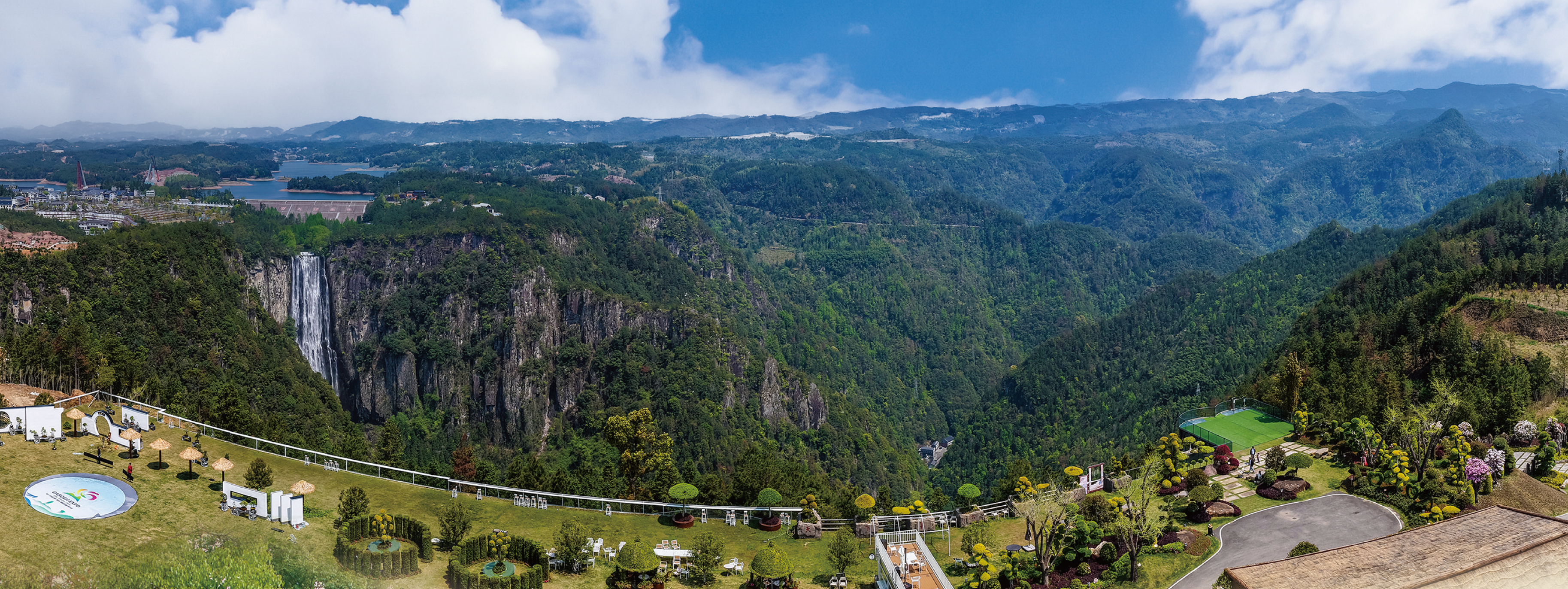 当走完所有游径,游玩兴致得到释放和满足,回到分会场主览点天湖创意苗木园的云顶草原,躺在大草坪上感受春日阳光照耀。或者坐在悬崖平台边静静喝着茶,享受和煦春风吹拂,再次把百丈漈瀑布风光尽收眼底,回味这场充满美与活力的旅行。