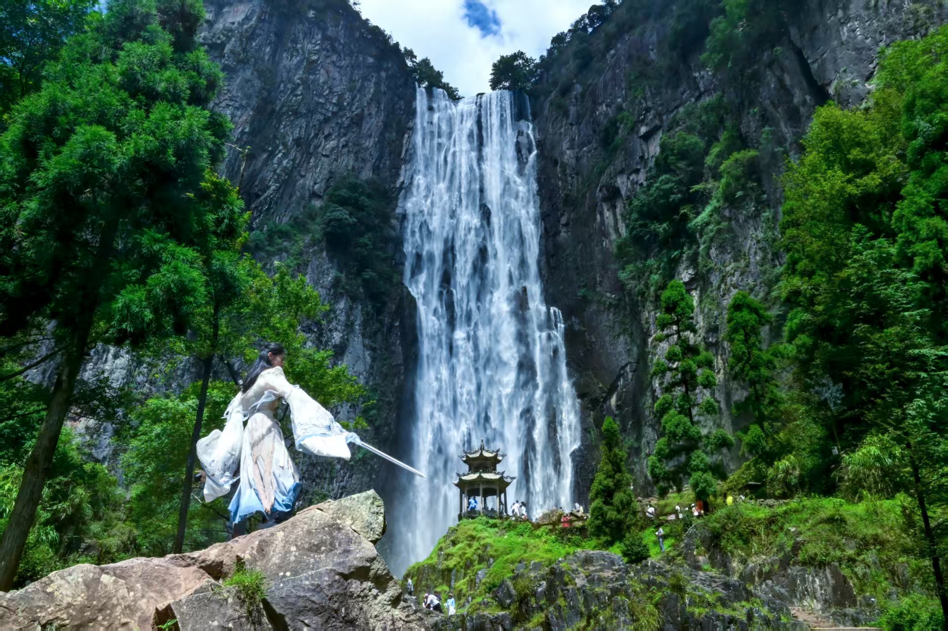 到刘伯温故里景区·百丈漈,换上戏装汉服,穿过隐藏在瀑布之后的古道,登上仙台、站在古亭前,以瀑布为背景,和这些年追过的剧实现同框出镜。蒙蒙水雾飘散,和风吹动衣袖,当这些动态被一瞬间定格,照片仿佛也罩上了一层仙气,再强大的滤镜和后期也难以营造出这种真实的仙境效果。