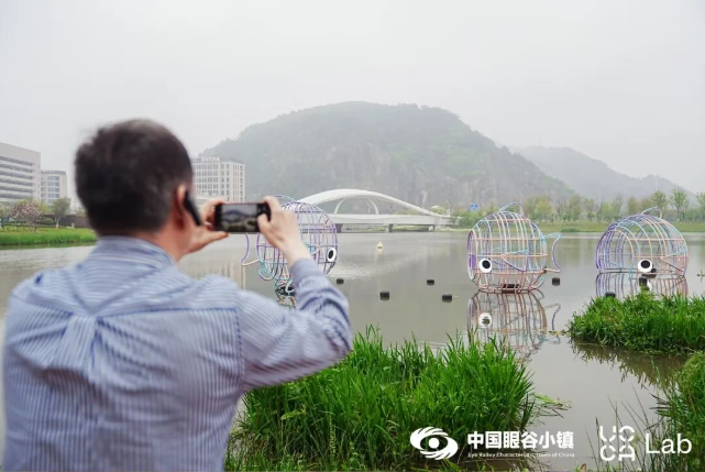 漫步至眼谷研学活动区,刘毅的《光语者》系列以散布于草地的霓虹装置构成拟人化形象,将日常物件转化为富有生命力的存在,在路径中与行人不断邂逅。在儿童活动区的近水域,Fn媒体实验室的灯光交互装置《(o 0 o)啵啵啵》则以温州人惯称的“胖头鱼”为灵感,通过手势触发鱼群游弋与光影流转,实现了人、生态与科技的趣味对话。