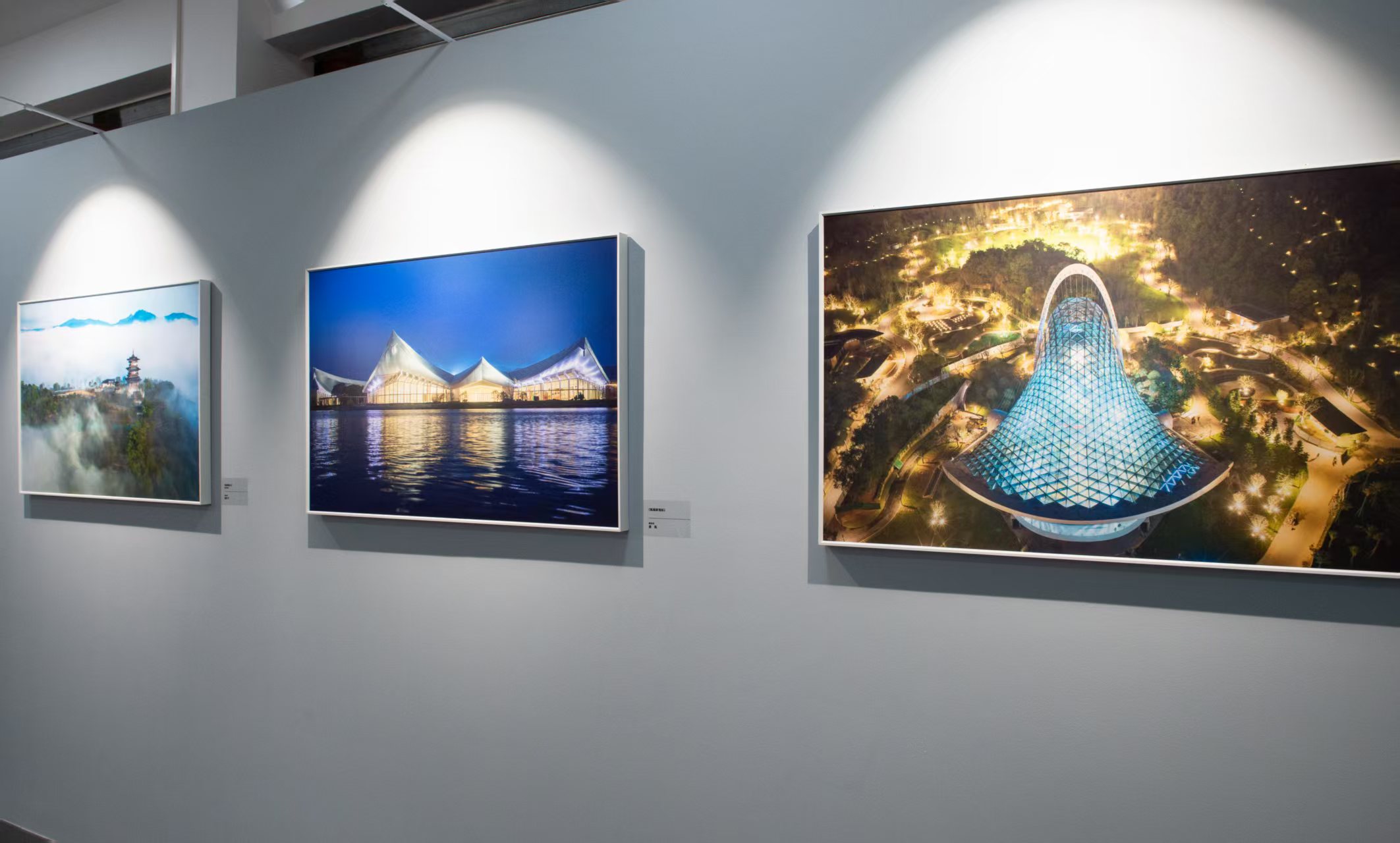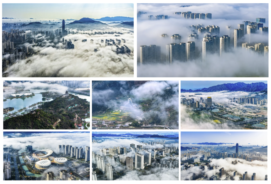 此外,潘东平的《仙阁临云》、王斌的《园博焕新颜》、夏林海的《夜韵温州·园博流光》等作品,亦从不同角度记录了园博园的建设风貌与景观神韵。《瓯海新地标园博园全景图》《浮光雾影》《园博夜韵灯光璀璨》《两馆完工倒计时》等作品,也以各自独特的视角,见证了园博园从建设到绽放的关键节点。