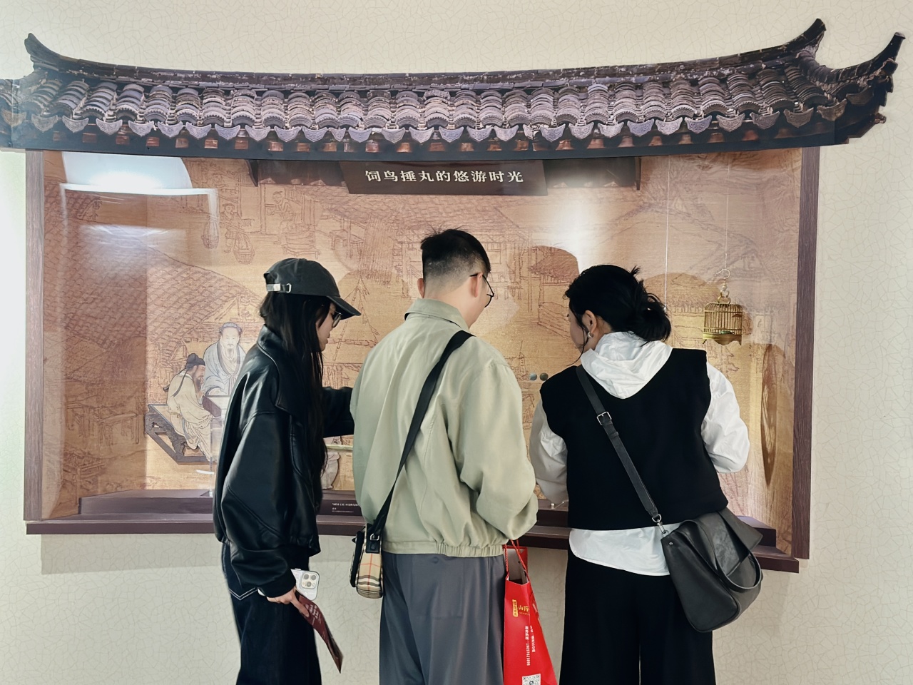娱乐展区同样鲜活有趣。展柜中的儿童捶丸球具堪称“宋代版高尔夫”,小巧的鸟食罐则透露出养鸟逗宠的生活闲趣。一件残破的南宋瓯窑青釉褐彩卷草纹腰鼓颇为特别,纹饰带有中东“风滚草”风格。观众轻拍一旁复原品,便能与千年前的鼓点节奏同频共振。