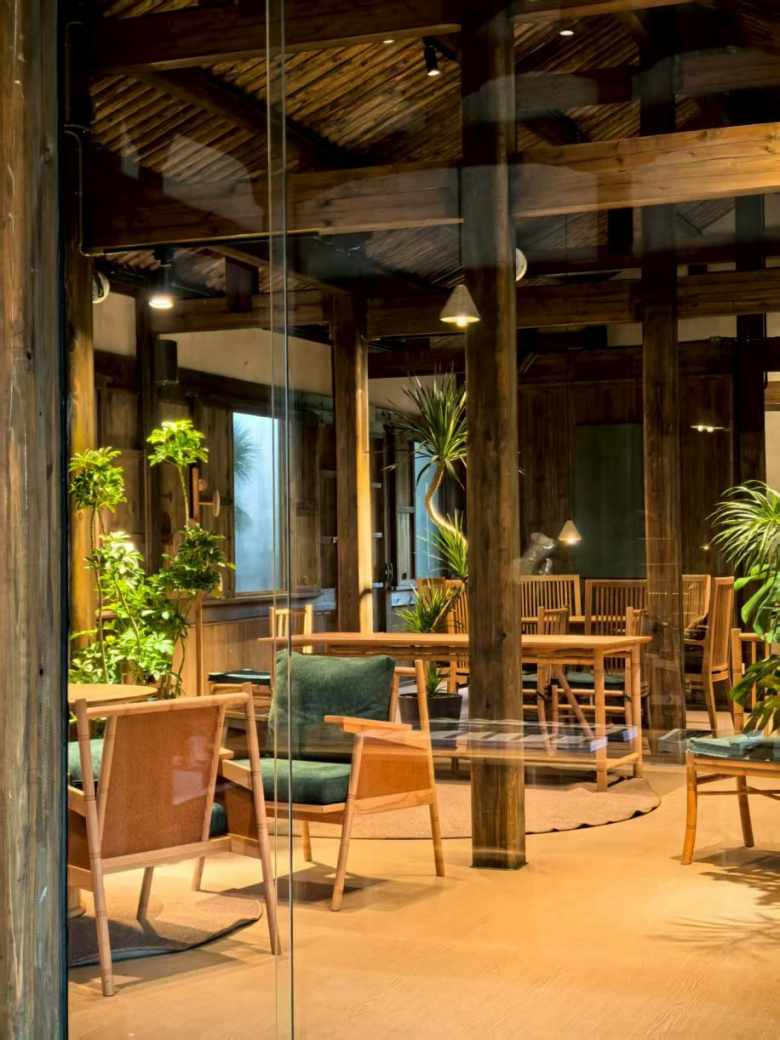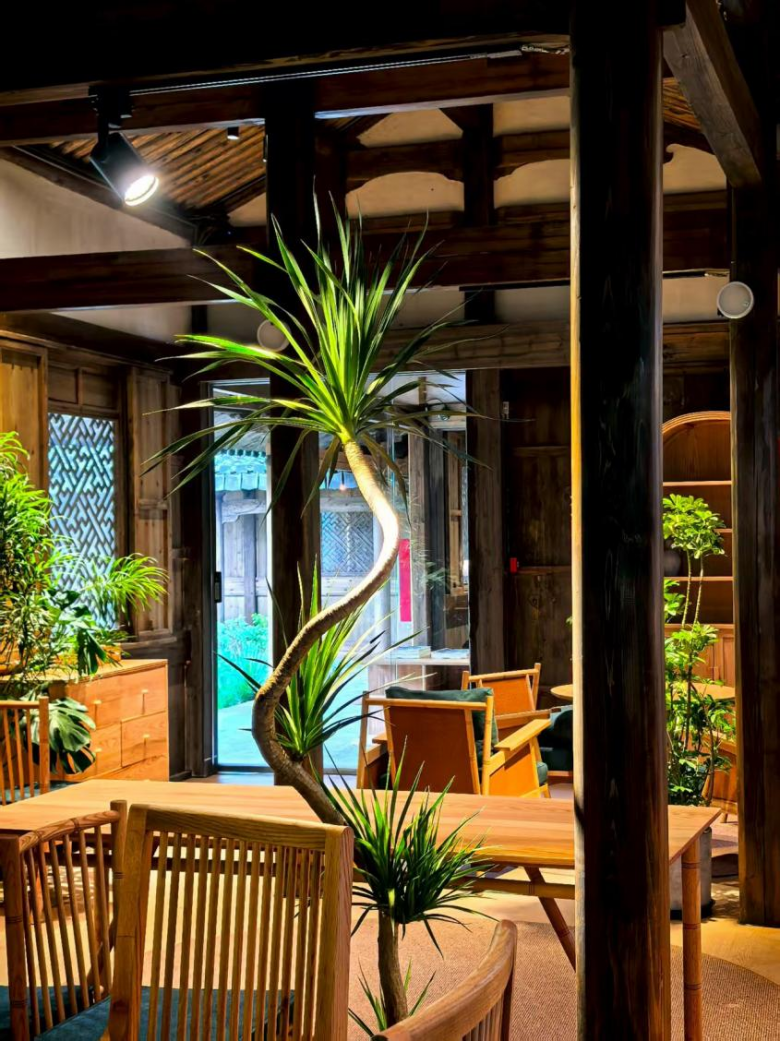 整座建筑群占地两千余平方米,现设百余桌位。暖黄灯光与绿植点缀于柱廊、花格窗之间,既延续了黛瓦青苔的木构古朴,又以舒适的现代空间消弭了历史的疏离感。