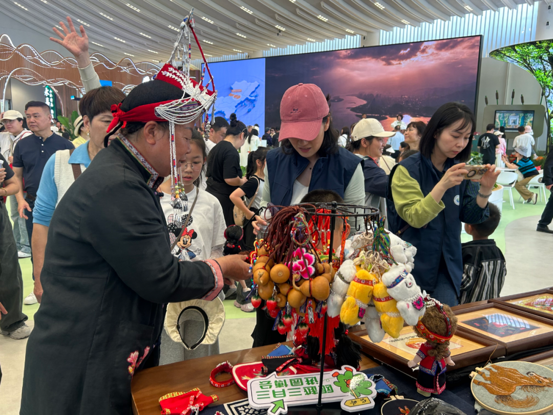 此外,苍南馆内还陈列着黄精食品、非遗产品等特色展品,可爱的民族人偶与游客频频互动。现场发放的“无尽蓝绿山海苍南”宣传册,全面推介苍南网红业态、特色小吃与文旅资源。据悉,在温州园博会期间,苍南馆将持续优化更新展品,不断补充更多极具苍南地域特色的农文旅产品。