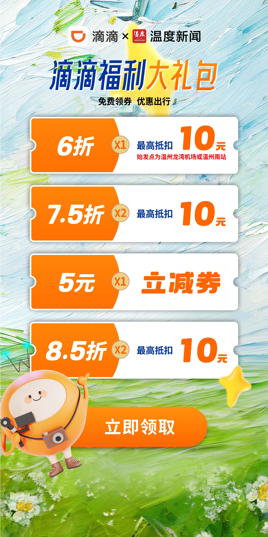 (1)6折最高抵扣10元1张(始发点为温州龙湾国际机场或温州南/北站)