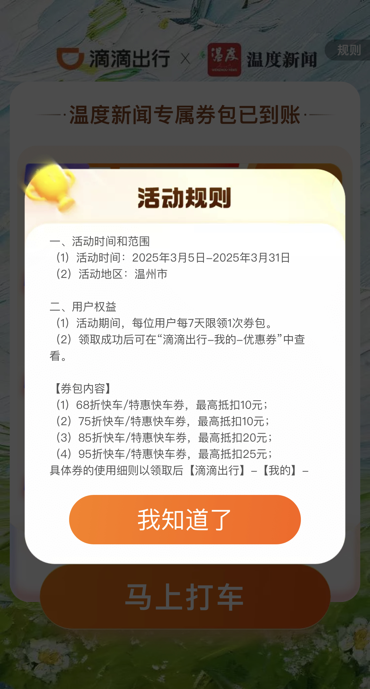 活动规则:券包限制浙江地区可用,滴滴快车、滴滴特快可用。(其中,6.8折活动券包仅限温州地区使用)