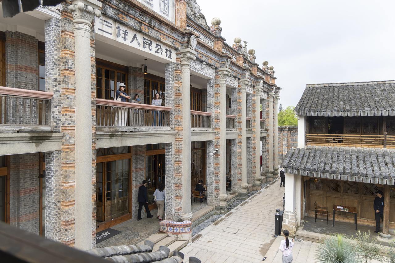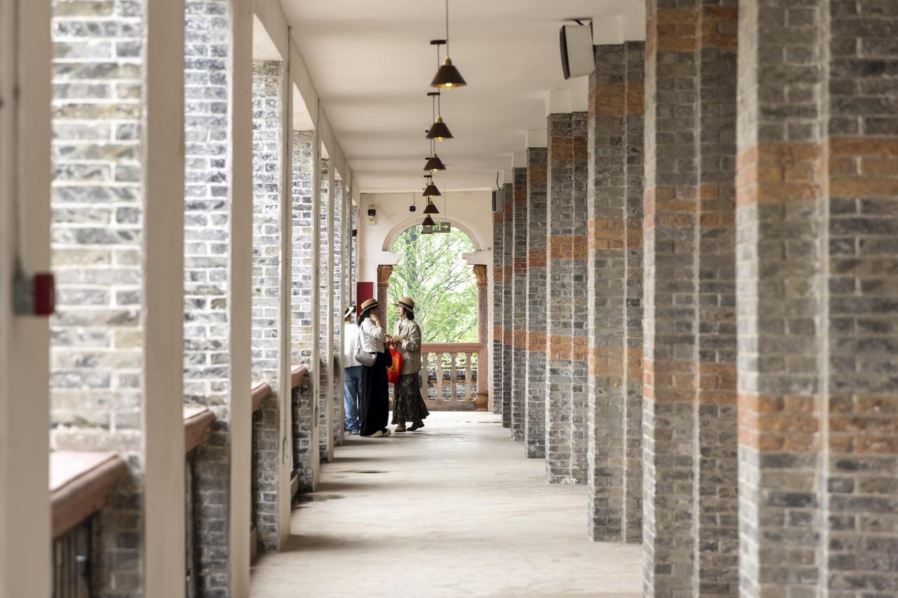 昔日居住空间变为客座区,梁枋、隔墙乃至传统神龛均被保留;民国主楼开阔的连廊与拱券下,咖啡香气弥漫。值得一提的是,主楼二层被专门开辟为公益艺术展厅,首展《垟间花事》油画作品展,画作与窗外湿地景致遥相呼应,使建筑本身成为可阅读的“展品”。
