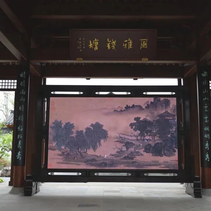 古典园林邂逅前沿科技,碰撞出别样惊喜。翠雨厅内,会“动”的电子屏风惊艳亮相——正面展南宋刘松年《四景山水图》,绘尽西湖春色;背面题苏轼《饮湖上初晴后雨》,画境与诗境交相辉映。