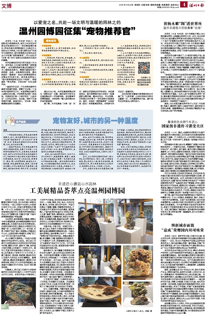 据了解,本次征集是“共享‘宠’时光”宠物友好游园会的先导活动。在征集结束后,温州园博园内将计划举办一场集宠物主题市集、趣味运动会、专业写真、文明倡议发布等于一体的宠物乐游园活动。届时,当选的“宠物推荐官”及其家庭(宠主)将被邀请至现场,共同参与和见证这一温暖时刻。