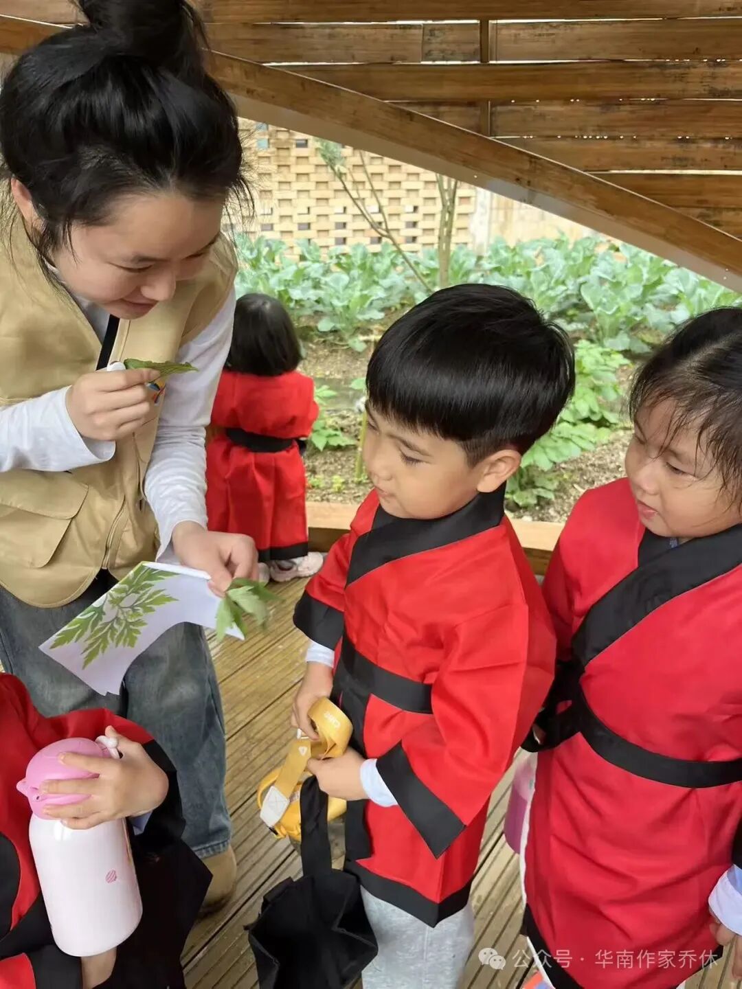 在秋亭里,晶晶老师正在为春风队小朋友讲解“识百草”课程。只见她拿出事先采摘的叶子,让大家闻一闻:“小朋友,知道这是什么东西吗?”孩子们面面相觑,只觉得凉丝丝的,说不出什么名字。这时,一个男孩子说:“老师,我知道,这是薄荷。”