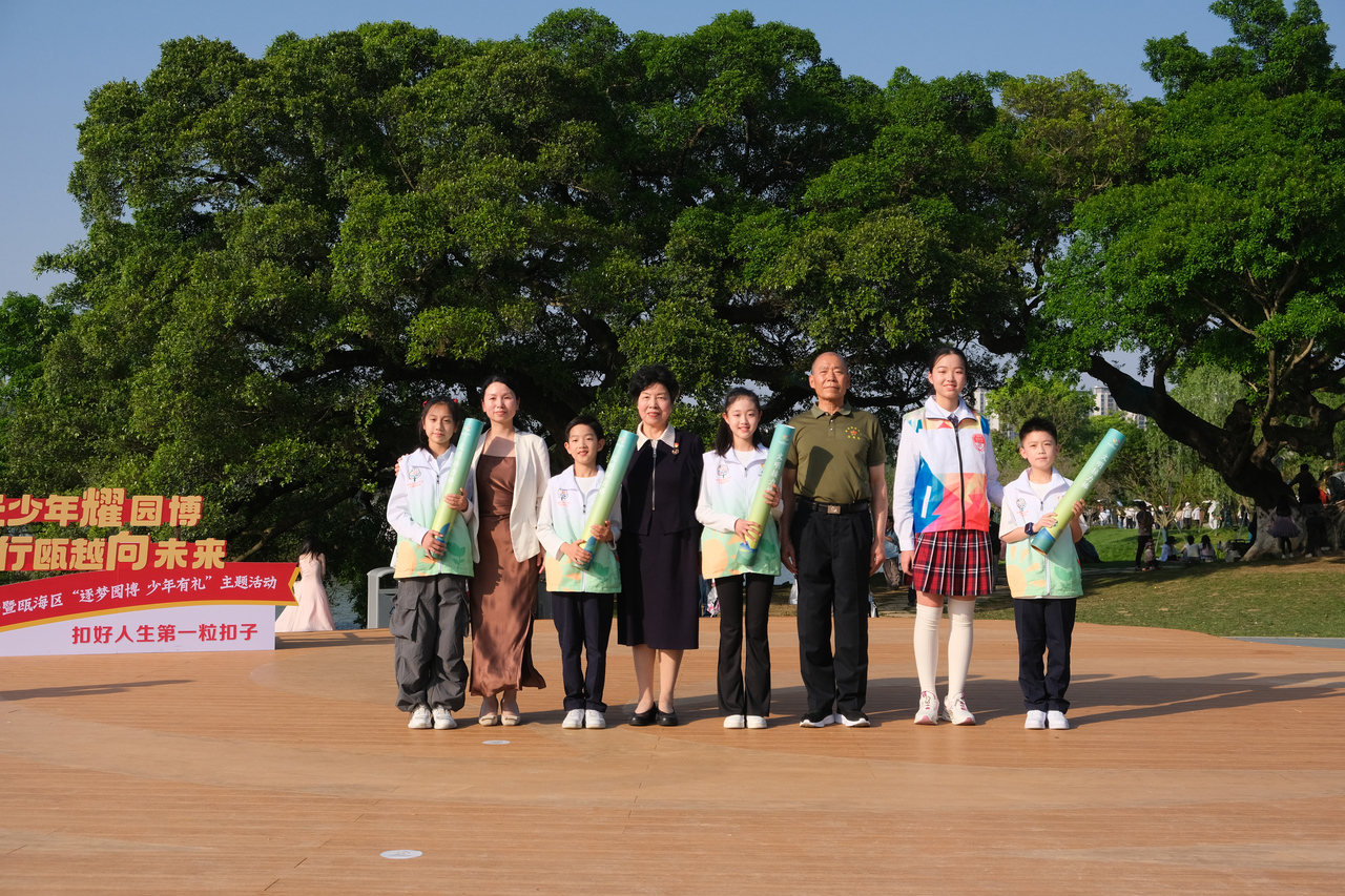 “榕光少年”取意于榕树坚韧扎根、向阳生长之态,象征少年如榕树般深植瓯越文化、传递文明光芒。宣传团旨在发挥未成年人力量,以“小手拉大手”的形式,向游客传递文明游园理念,为园博会营造文明、有序、和谐的游览氛围,实现“少年讲园博、文明传万家”的双重价值。