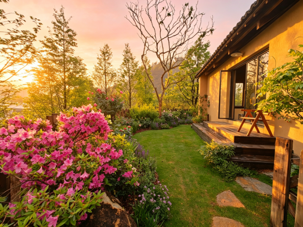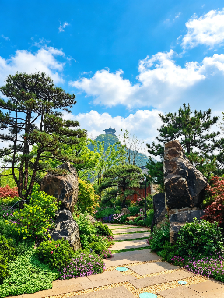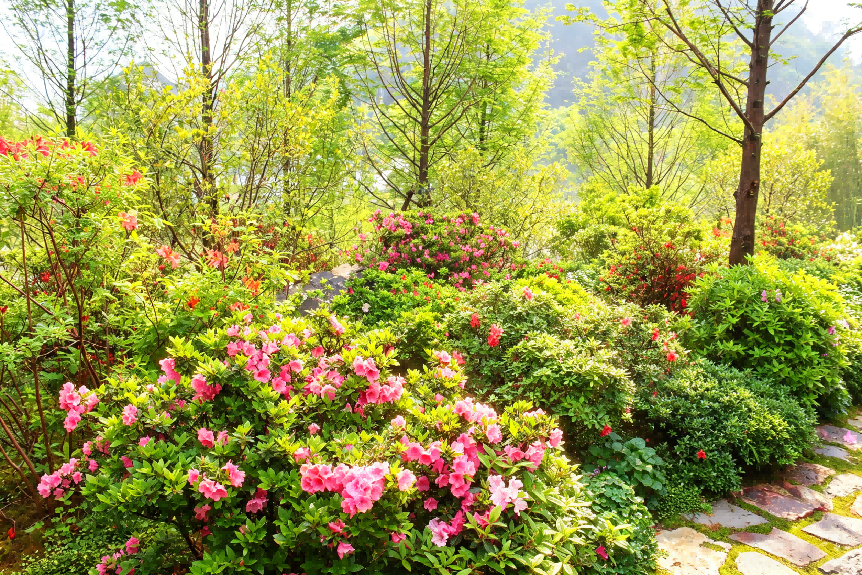 登顶制高点,杜鹃花坡近30个品种杜鹃漫山盛放,与远处郭公阁遥相呼应——这是园区里藏不住的“网红机位”。
