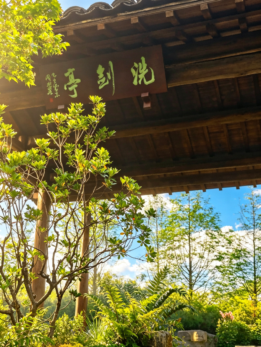拾级而上,有洗剑亭与洗剑池。池中一根金丝楠木形似古剑,风骨卓然。