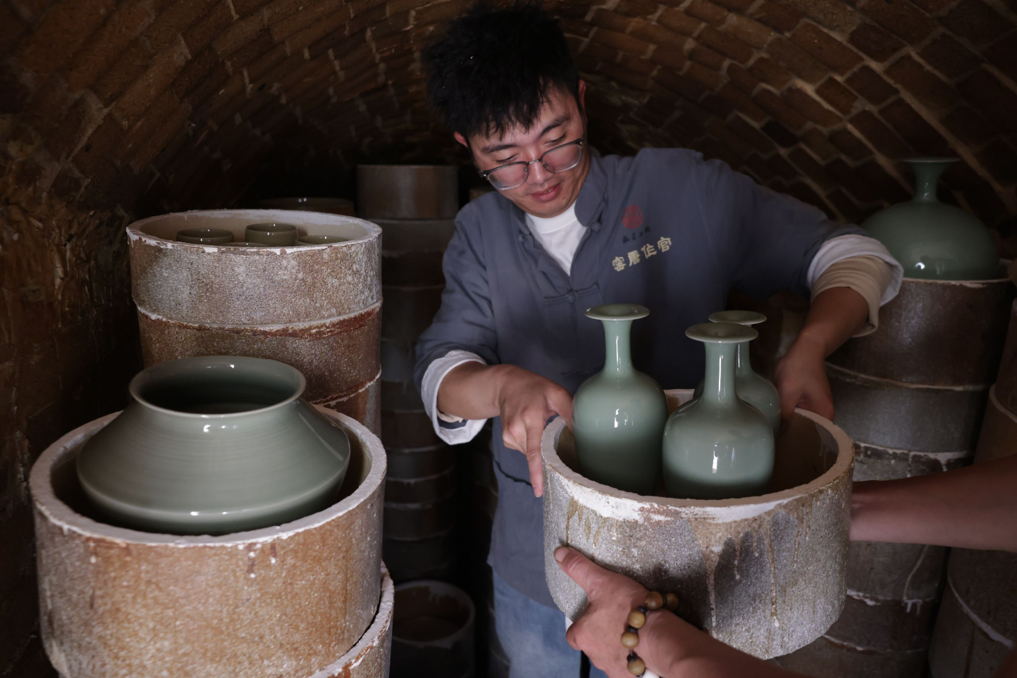 吉时既定,万众期待的开窑时刻正式到来。随着“开窑啰”的高亢喊声响起,官作唐窑厚重的窑门被章老师缓缓卸下,千余度高温淬炼后的热浪裹挟着青瓷的温润展现在世人面前,将本次开窑节推向高潮!