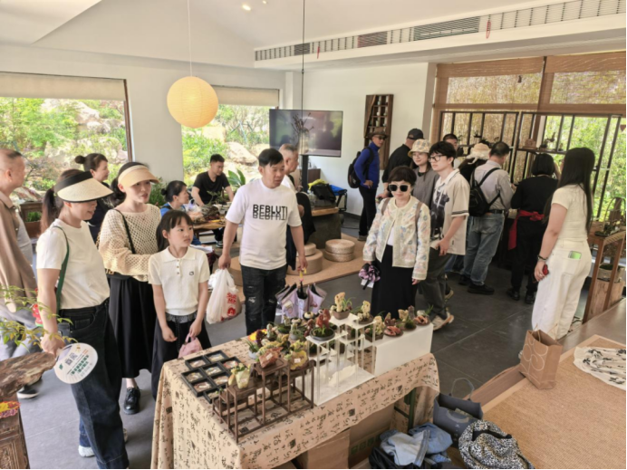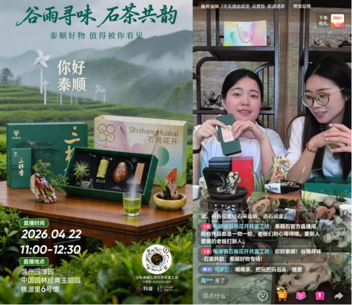 直播不止在线上。同一天,“石茶共韵”组合携手亮相温州园博园中国古典园林经典主题馆——桃源里6号馆。泰顺石文创盆景与三杯香春茶“打包”陈列,游客赏石之余,还能现场品饮珺泰龙“三杯香”茶。联合直播活动当日,接待游客超1000人次。