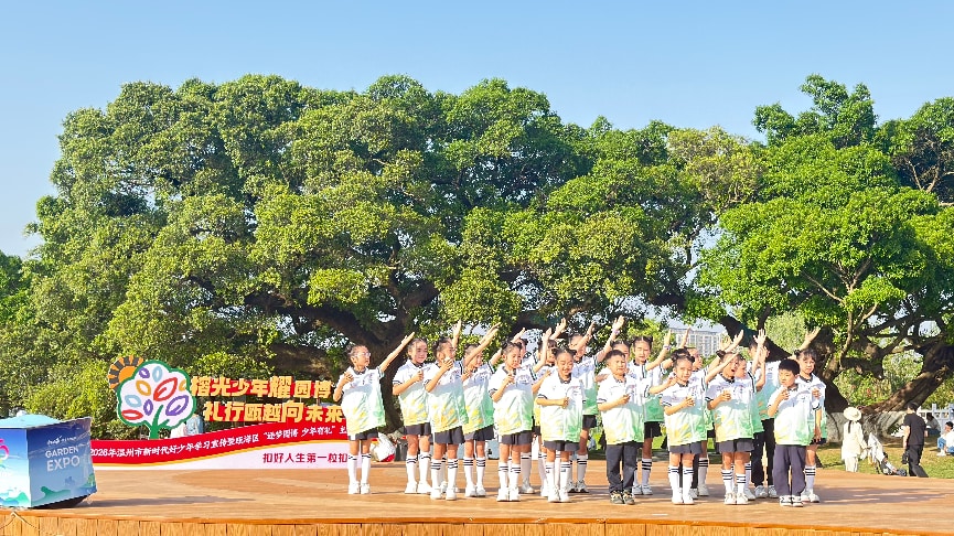 春风拂面,绿意满城。4月26日,2026年温州市新时代好少年学习宣传暨瓯海区“逐梦园博少年有礼”主题活动在浙江温州园博园举行。百名“榕光少年”以文明宣讲、志愿服务等形式,为第十五届中国国际园林博览会注入青春文明力量,让生态美景与文明风尚交相辉映、相得益章。