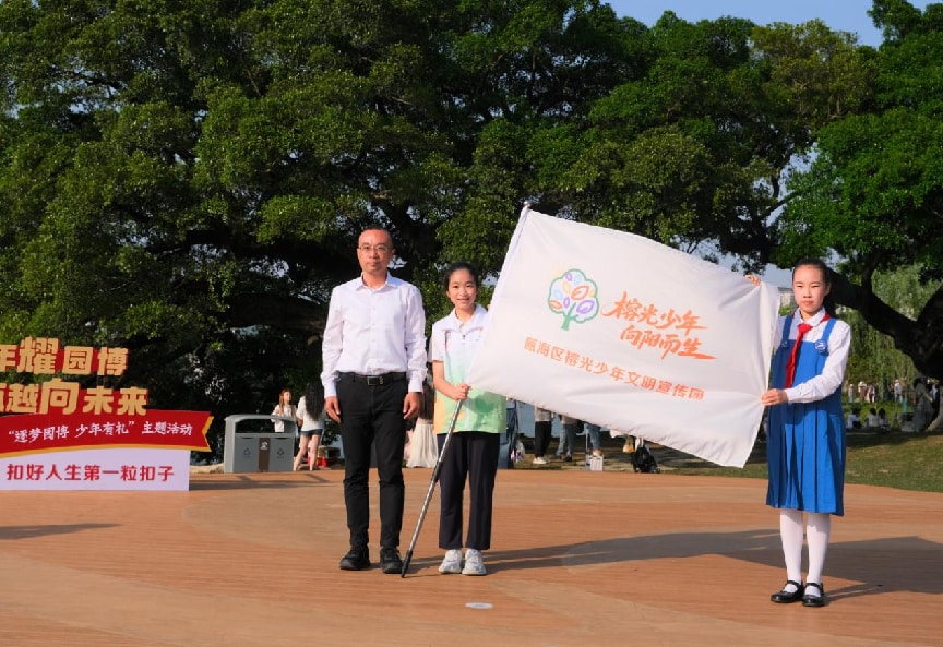 活动现场,“榕光少年”文明宣传团授旗成立,百名少年成为温州园博园首批文明宣传员。“榕光少年”取意于榕树坚韧扎根、向阳生长之态,象征少年如榕树般深植瓯越文化、传递文明光芒。宣传团将以“小手拉大手”带动社会文明,在园区开展文明引导、生态科普、志愿宣讲等服务,为园博会营造文明、有序、和谐的游览氛围。