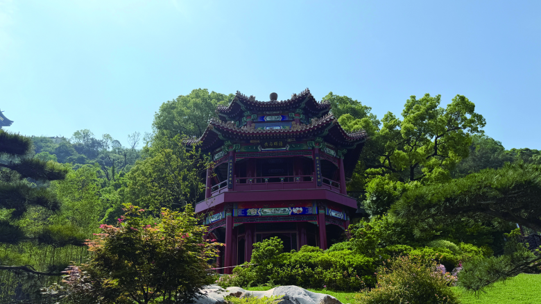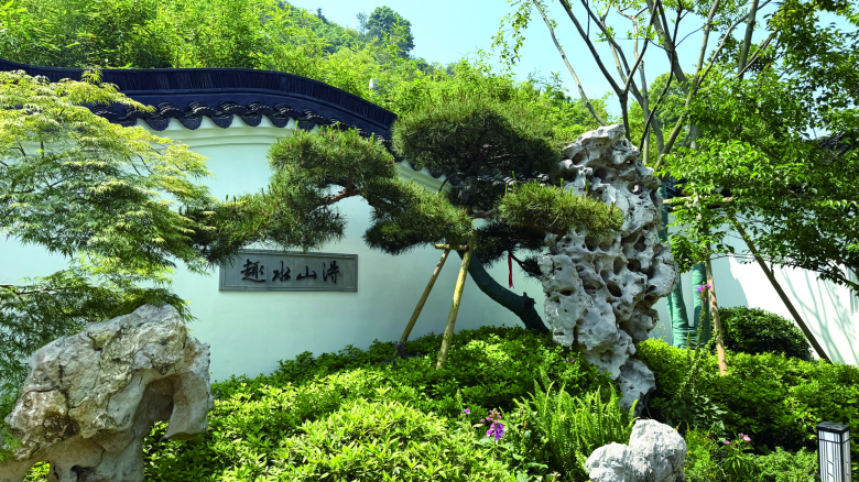 展园以“瓯海京韵,五樟灵境"为主题,沿用皇家园林轴线布局,借鉴颐和园山地造园手法,西侧清晖阁可登高望远,东侧澄鲜潭曲径通幽,融山地意趣与古都风韵于一体。细心观察,园内不仅保留原生古樟传承乡愁,还栽种温州山茶与北京月季两地市花,象征两地情谊。